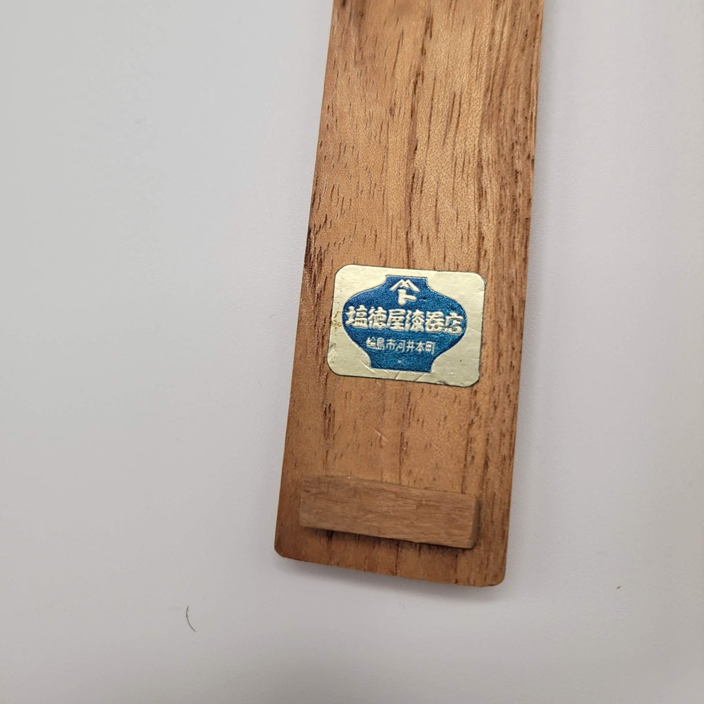 De doos draagt een originele sticker van 塩徳屋漆器店 (Shiokutoku-ya Shikkiten), een lakwerkwinkel uit Yamanaka (山中町本町). Deze regio in Ishikawa staat bekend om haar lange traditie van verfijnd lakwerk en ambachtelijke theeceremonie-objecten. De kalligrafie op het deksel duidt het object aan als chashaku (茶杓), de klassieke lepel waarmee matcha zorgvuldig wordt gedoseerd.