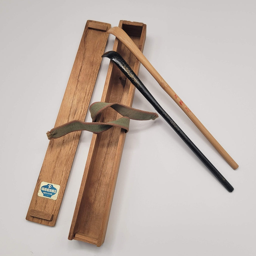 Een Japanse chashaku set die de stille elegantie van de theeceremonie weerspiegelt. Deze bijzondere combinatie bestaat uit een zwart gelakte matchalepel met subtiele goudsprenkels en een traditionele bamboe chashaku, samen gepresenteerd in een originele houten tomobako. De set brengt de balans tussen natuurlijke eenvoud en verfijnd urushi-lakwerk samen een kenmerk dat binnen de Japanse theecultuur hoog wordt gewaardeerd.