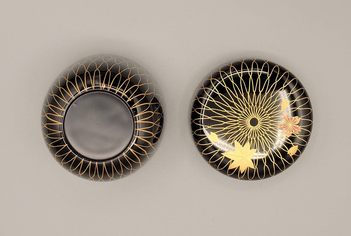 The deep-gloss black lacquer sets the stage for a delicate gold maki-e net motif, merging the seasons: cherry blossoms (sakura) for spring and maple leaves (momiji) for autumn, lightly dancing across the surface. The intricate pattern exudes tranquility, rhythm, and refinement, with a perfect balance between symmetry and poetry.